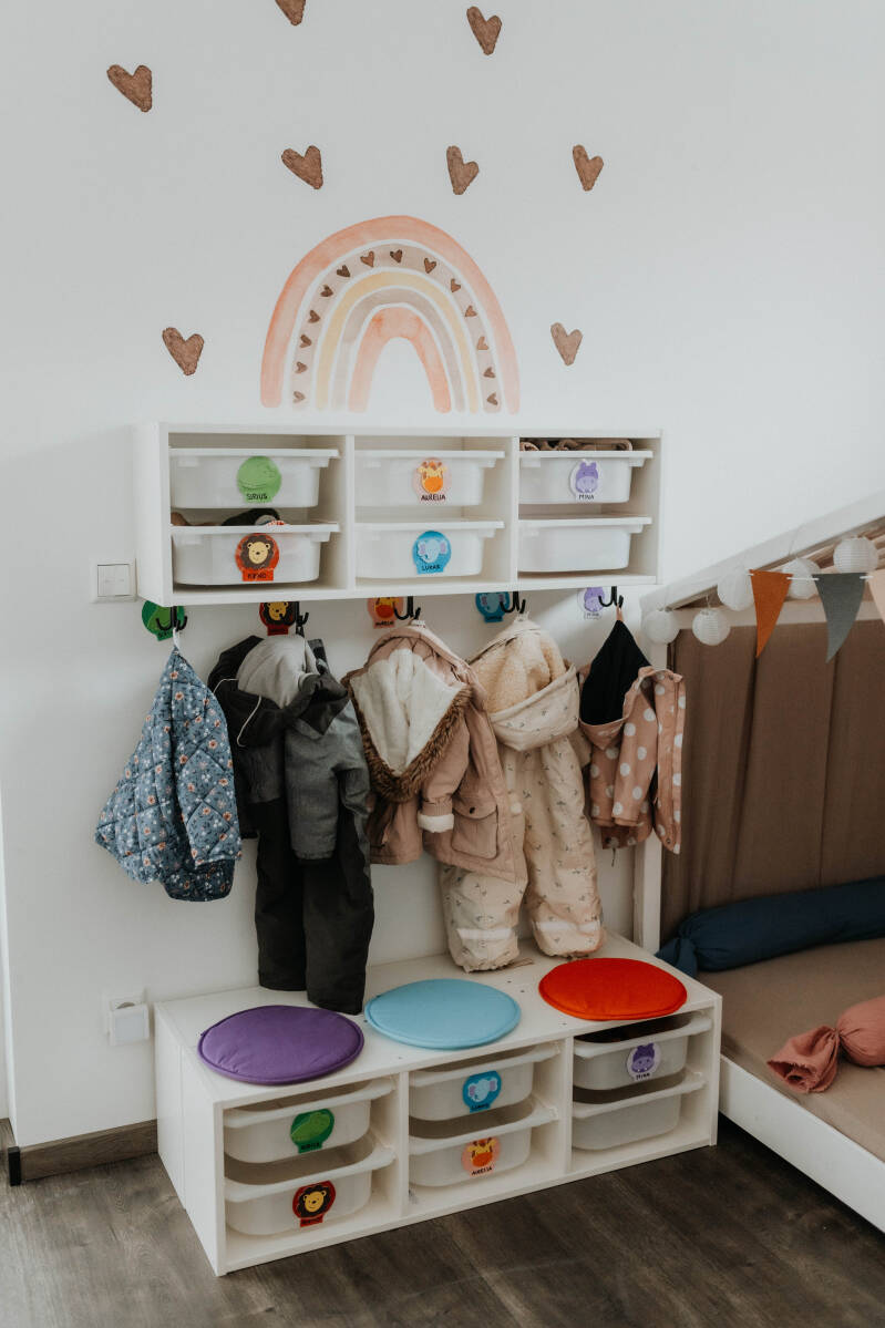 Mittagsruhe und einen separaten Eingang, welcher für das Bringen und Abholen genutzt wird. Ebenso werden hier die persönlichen Gegenstände wie z.B. Wechselklamotten, Schlafutensilien, Matsch-Sachen, Schuhe etc. aufbewahrt.